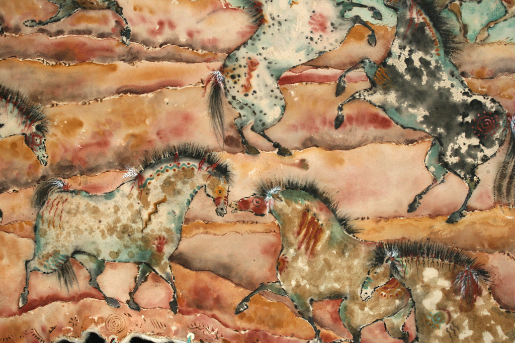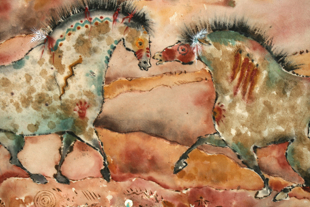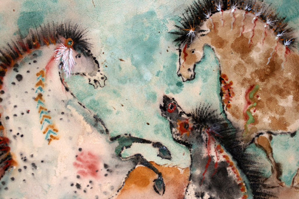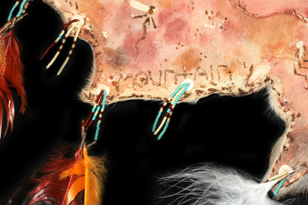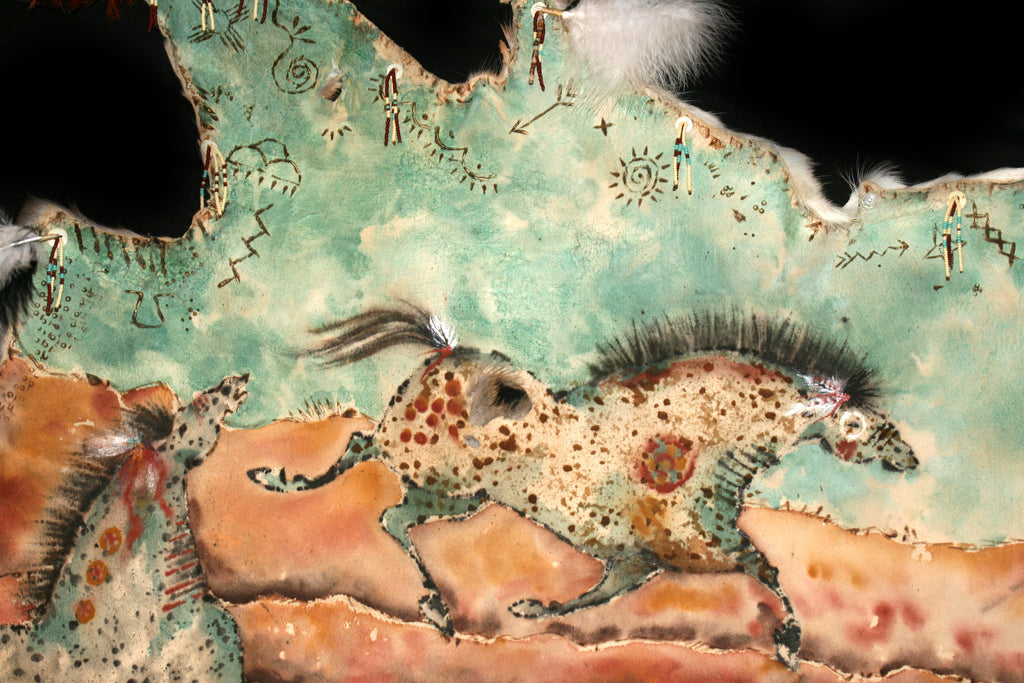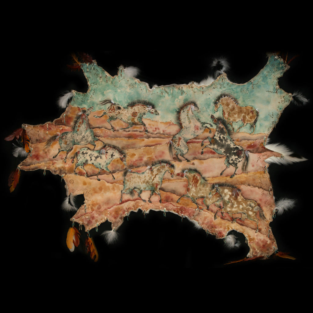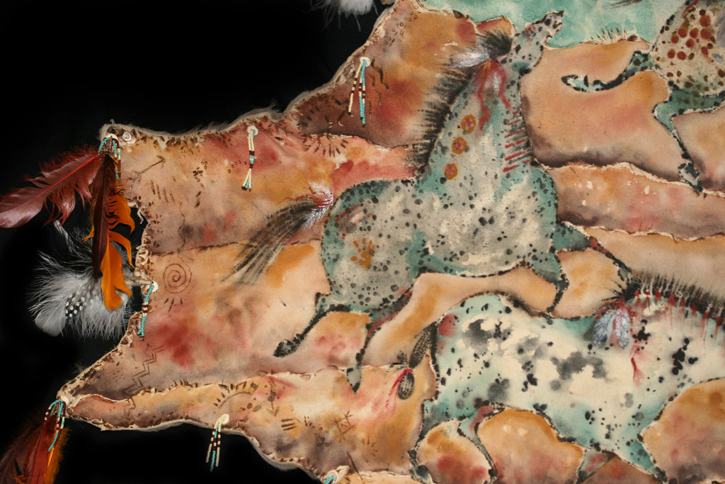 Painted in a loose watercolor style on white tail deer, this hide is framed with burned in native symbols, beaded fringe, and feather accents.