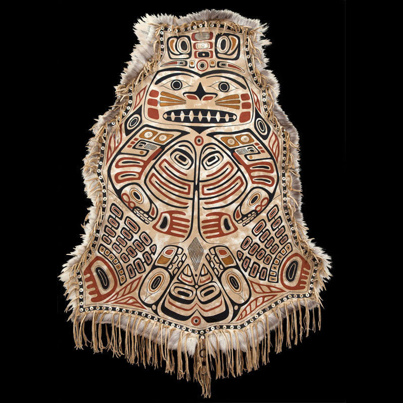 Painted on caribou hide, this design represents the Chilkat style. It is outlined in soft leather fringe and mother of pearl buttons.
