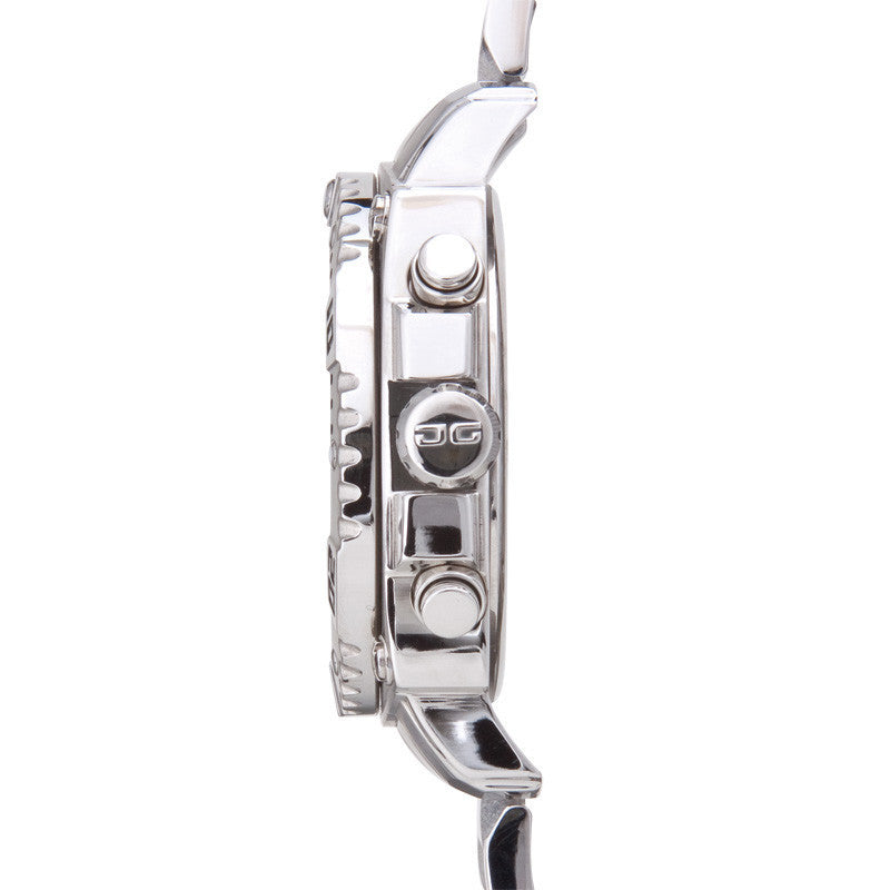 The Jorg Gray 9800-11 watch is cased from solid stainless steel with a turning bezel and luminous dots, features a black 2 layer dial with applied silver chrono-eyes, silver index, Swiss ISA chronograph movement with date display, domed sapphire crystal, solid stainless steel bracelet with safety clasp, water resistant up to 100 meters.