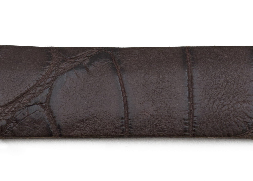 Genuine Louisiana Alligator, the finest exotic skin, is the heart of Black Arrow belts. With its classic finish, it is truly the diamond of exotic leathers. Our belt makers time tested skills and hand cutting techniques allow them to craft belts that are unique, highlighting the individual characteristics of the skin and affording them the opportunity to craft one piece belts. Buckle Not Included. This is our Chocolate Matte color. Color, texture and skin pattern may vary slightly from sample, as every alligator skin is different and unique.