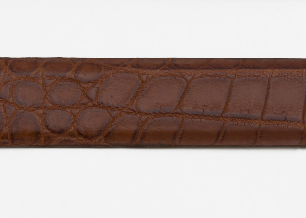 Genuine Louisiana Alligator, the finest exotic skin, is the heart of Black Arrow belts. With its classic finish, it is truly the diamond of exotic leathers. Our belt makers time tested skills and hand cutting techniques allow them to craft belts that are unique, highlighting the individual characteristics of the skin and affording them the opportunity to craft one piece belts. Buckle Not Included. This is our Cognac Matte color. Color, texture and skin pattern may vary slightly from sample, as every alligator skin is different and unique.