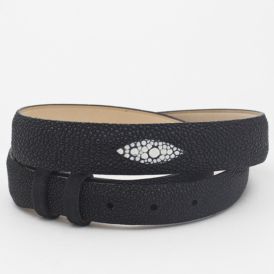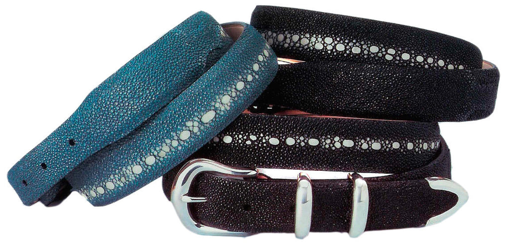 The picture of grace and strength in the water, Stingray truly is a most enchanting exotic leather. Every Stingray bears a natural diamond shape mark that consists of white bone. All of our Stingray belts come with that signature mark. You can choose from a simple diamond in the back of the strap or a string of bone like the photo shown. Buckle Not Included.