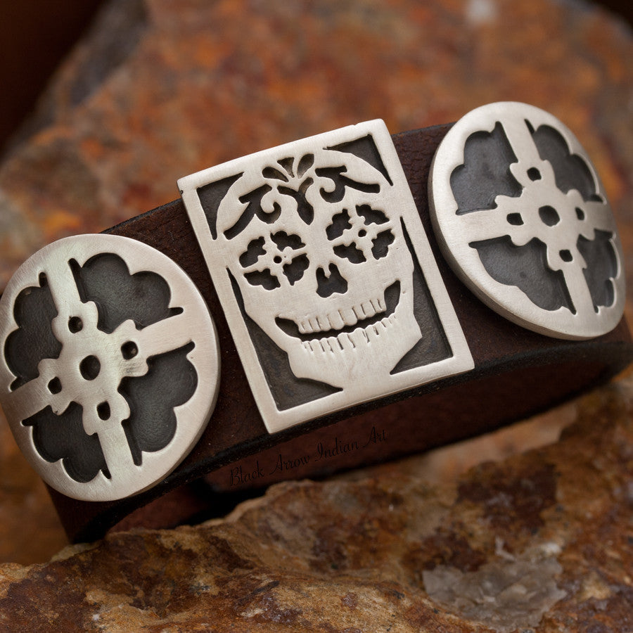 David Rosales Sterling Silver Skull and Leather Strap Bracelet