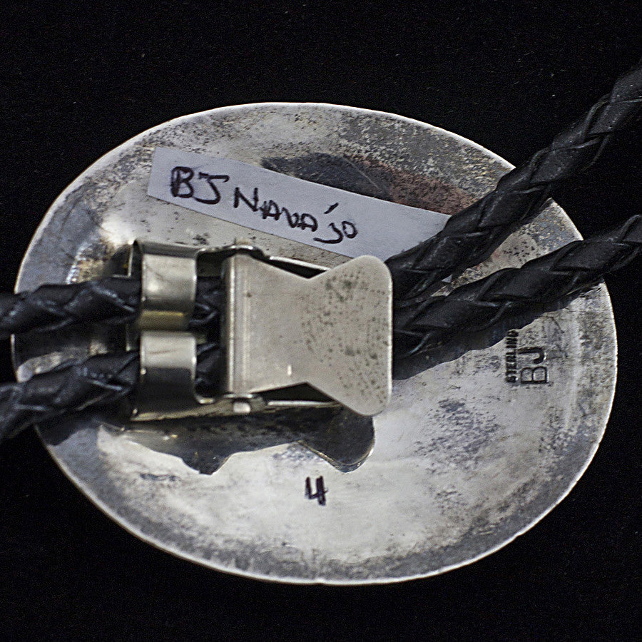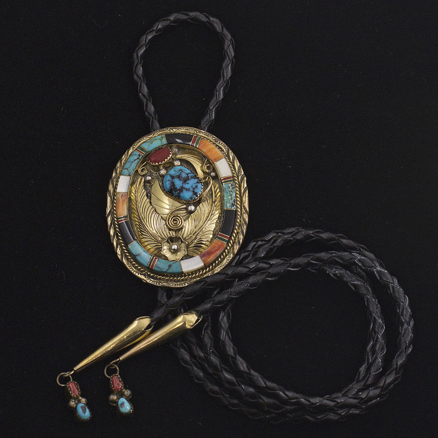 This beautiful BJ Navajo Bolo is crafted in gold and inlaid with Mother of Pearl, Turquoise, Spiny Oyster and Black Onyx. The strap is leather. This bolo has a matching Trophy Buckle. Click HERE to view the Buckle.
