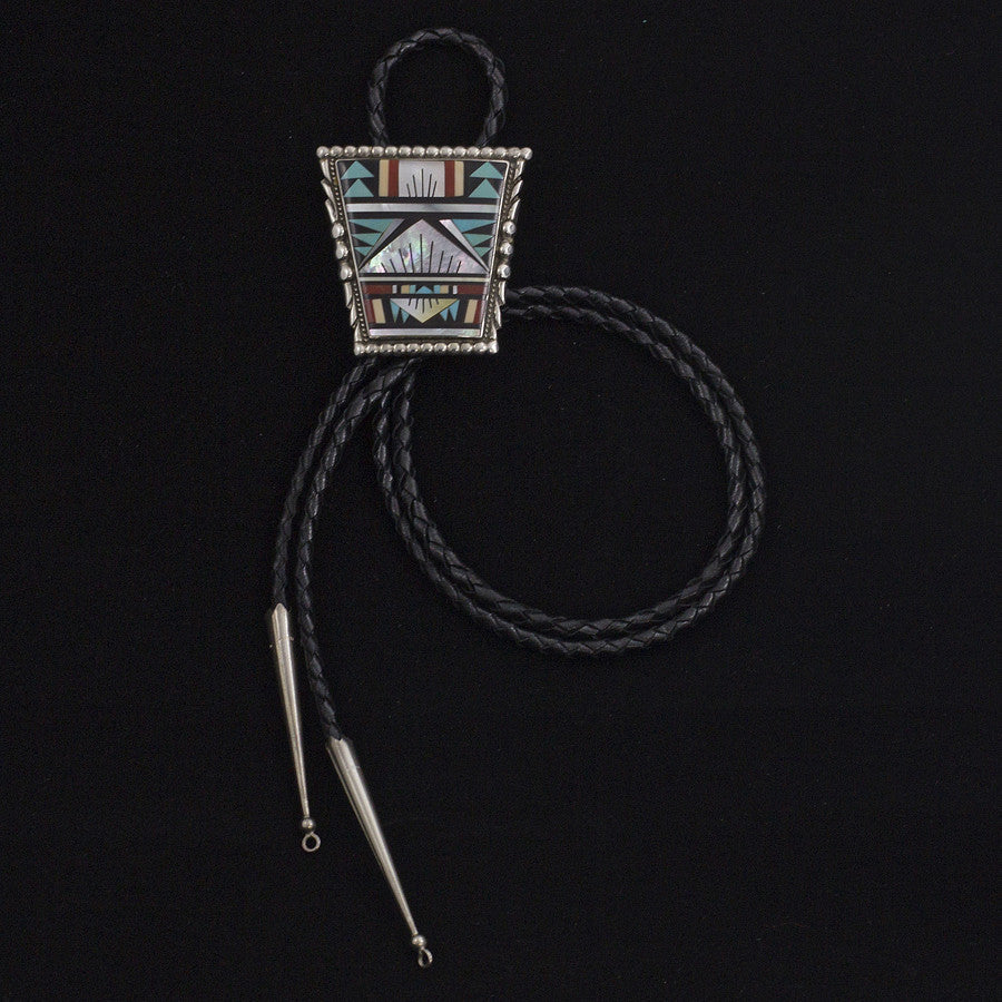 This beautiful AD Zuni Bolo and Buckle Set is crafted in Sterling Silver and inlaid with Mother of Pearl, Turquoise, Red Coral and Black Onyx. The Bolo strap is leather. To view the matching Buckle, click HERE.