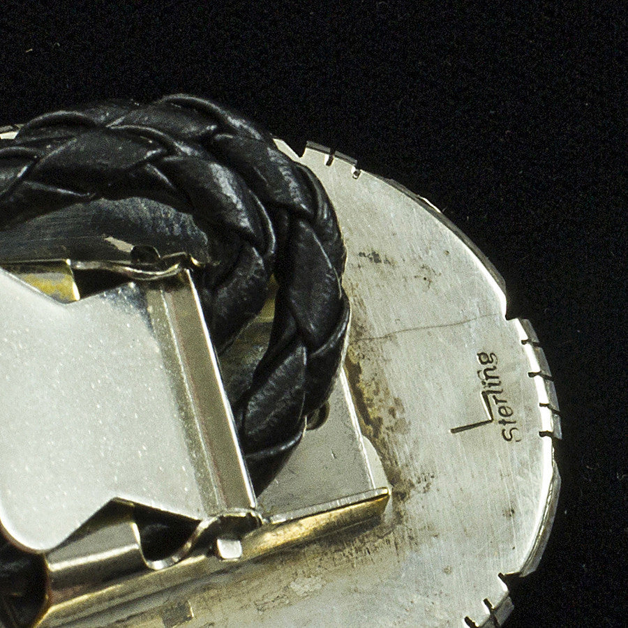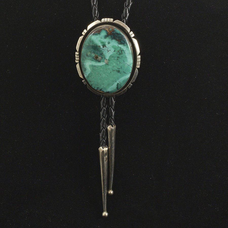 This beautiful Bolo is crafted in Sterling Silver with Turquoise. The strap is leather.