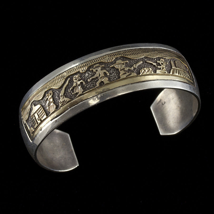 This Cuff Bracelet is crafted in Sterling Silver and 12K Gold filling. The Hallmark is TSK.