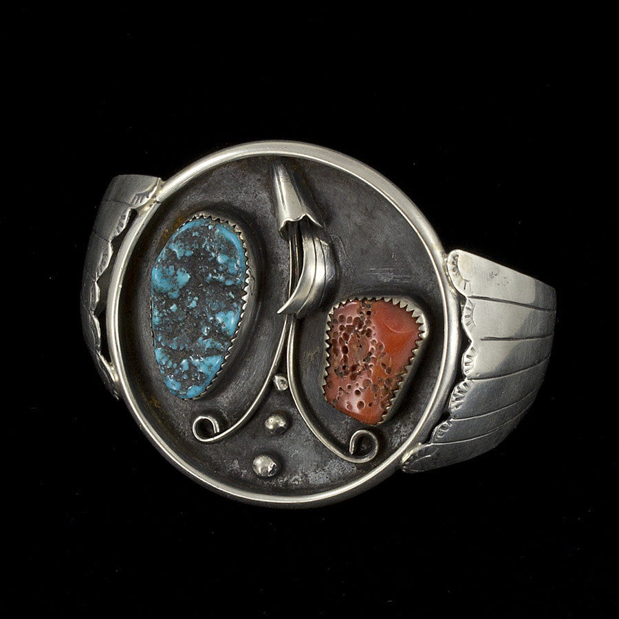 This elegant Cuff Bracelet is crafted in Sterling Silver and set with Turquoise and Red Coral. The Hallmark reads "LB".