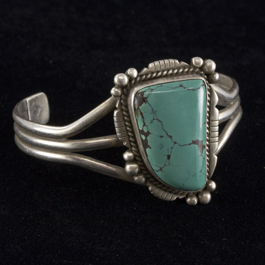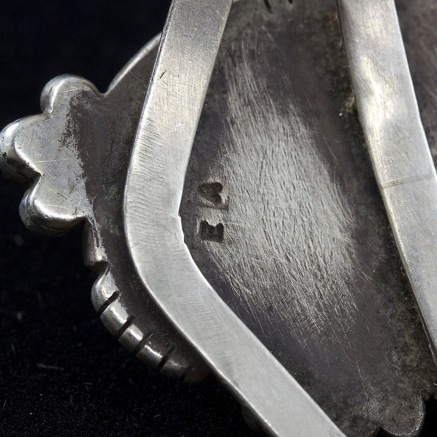 This Cuff Bracelet is crafted in Sterling Silver set with Turquoise. The Hallmark reads "EA".