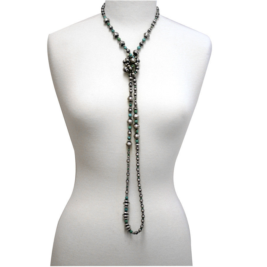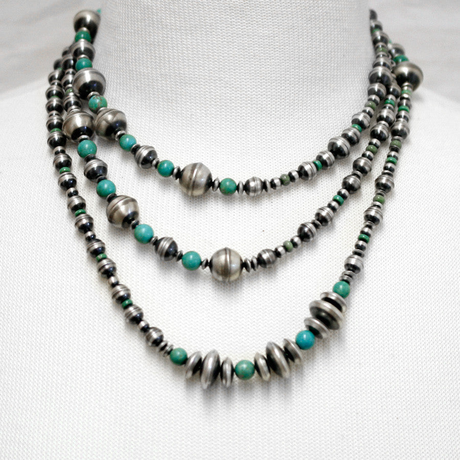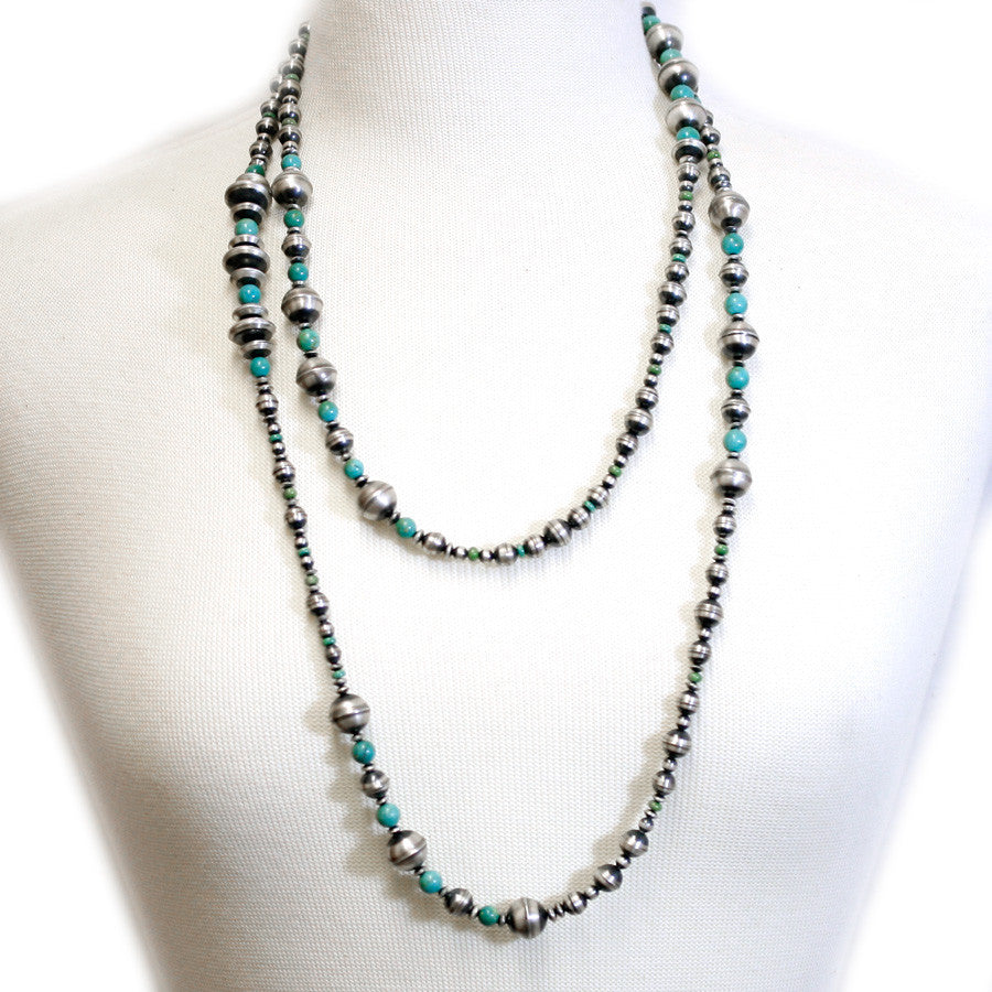 This beautiful Traditional Sterling Silver and Turquoise Antiqued Beaded Navajo Necklace is 1 strand, but can be wrapped 2 or 3 times for different lengths. The full length is 60" with beads tapering 5mm to 16mm. Created by Navajo jewelers and Navajo silversmiths. Colors may vary due to different computer monitors.