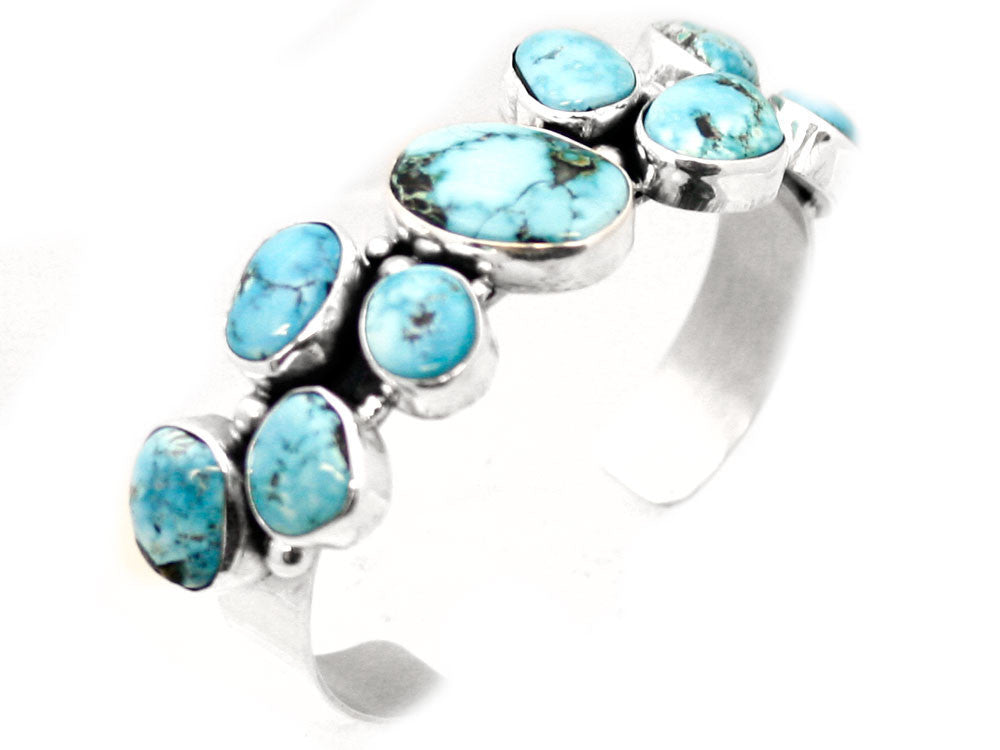 This beautiful Sterling Silver Cuff bracelet features Blue Moon Nevada Turquoise. Hand crafted by Navajo Artist B. Johnson.
