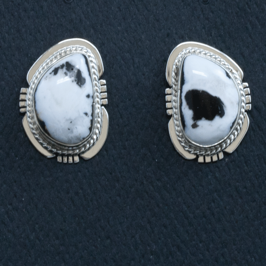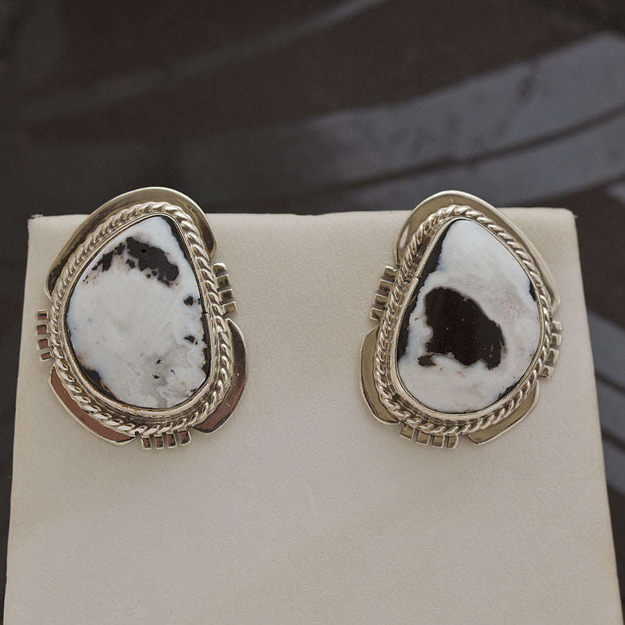 These handmade earrings feature White Buffalo, made by Navajo Craftsmen.