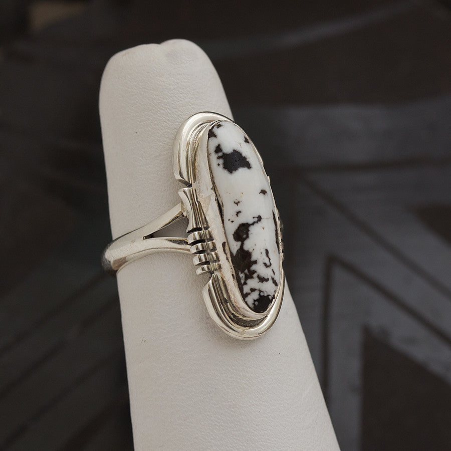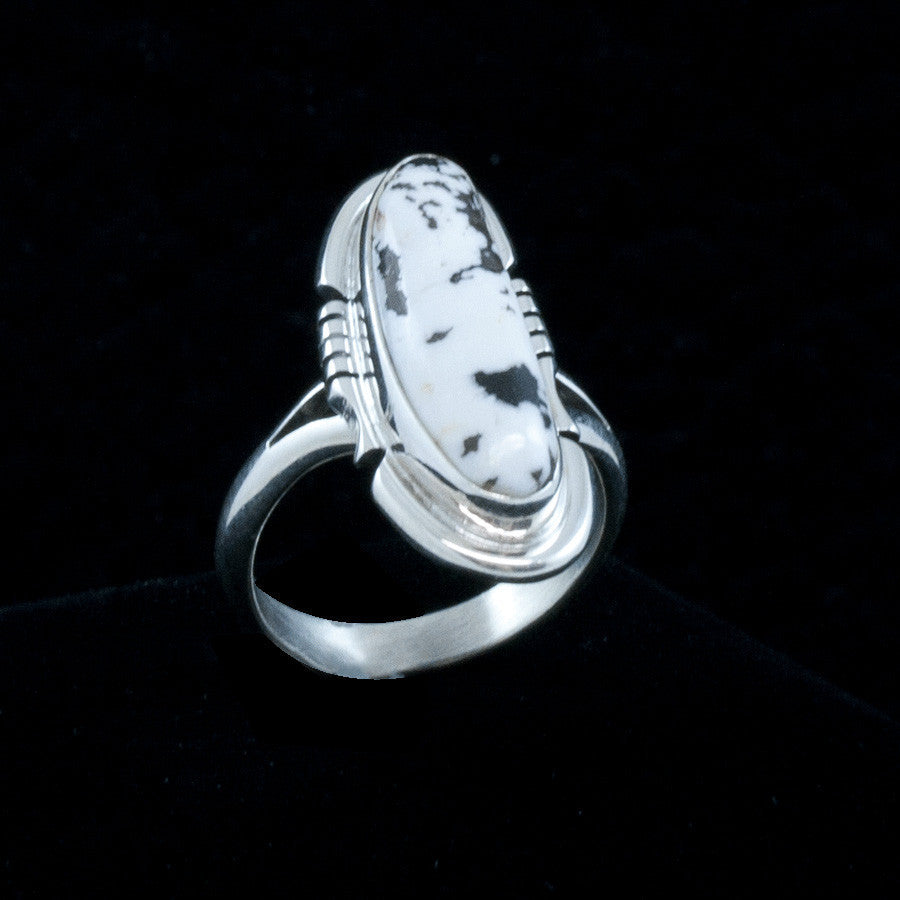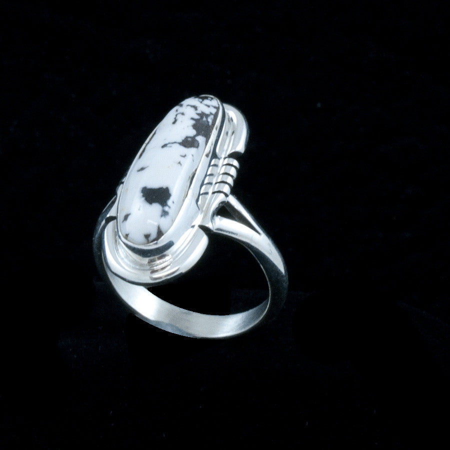 White Buffalo is actually opalized calcite and quartz with black chert. It is a beautiful white stone with black matrix sometimes blotched or spider webbed that is mined out of Nevada, North of Tonapah. This stone takes a great polish, and cuts like turquoise.